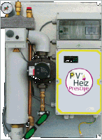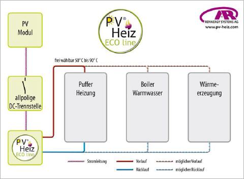 Der durch die Photovoltaik erzeugte Gleichstrom wird direkt (ohne Wechselrichter) mittels Elektroheizstab in heißes Heizungs- oder Brauchwasser umgewandelt. Über einen Thermostat wird der Wasserinhalt (ca. 3 Liter) auf eine einstellbare Temperatur (z.B. 50° C bis 95° C) erhitzt. Das heiße Wasser wird von einer Hocheffizienzpumpe zum Verbraucher geleitet oder zum Beladen eines Puffer- oder Brauchwasserspeichers verwendet.