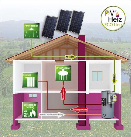 Die hochwertigen Photovoltaikmodule, das elektrische Heizelement sowie die Gesamtsteuerung sind für die Heizungs- oder Warmwassererzeugung verantwortlich. Mit dem Strom von der Photovoltaikanlage wird das Heizelement erhitzt und damit das Wasser im Heizungssystem erwärmt. Die erzeugte Wärme steht mit frei wählbarer Temperatur zur Verwendung bereit.