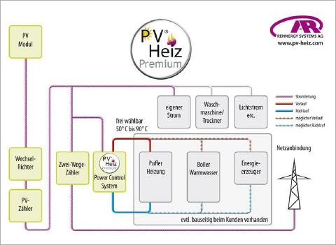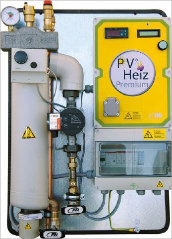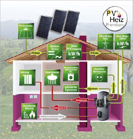 Der durch die Photovoltaik erzeugte Gleichstrom wird über den Wechselrichter in netzüblichen Drehstrom 230/400 V umgewandelt. Die Wärmeproduktion erfolgt über einen kaskadierbaren Elektroheizstab mit sechs Leistungsstufen von 1 bis 6 kW oder 9 kW. Dadurch kann die Heizungsanlage erheblich durch die Photovoltaikanlage unterstützt werden. Das integrierte "Power Control System" erfasst die Einspeiseleistung sowie den Energiebedarf und schaltet die Leistungsstufen entsprechend, um die bestmögliche Eigenstromnutzung zu erzielen.